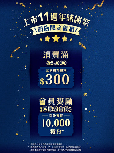 SINOMAX 用心製造每一床褥,採用優質物料及仔細工藝製作,更為特定系列床褥提供長達 20 年保用服務,保用條款服務包括首年免費上門檢查,顧客只要於保用期內出示有效的購買收據,則可享有保用服務,讓你使用得更安心,更放心。