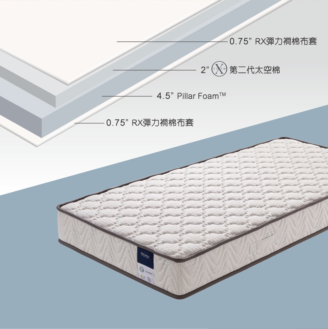 全方位護脊床褥採用RX彈力布套,貼合身體曲線的人體工學設計,提供中及中硬兩種睡感選擇。