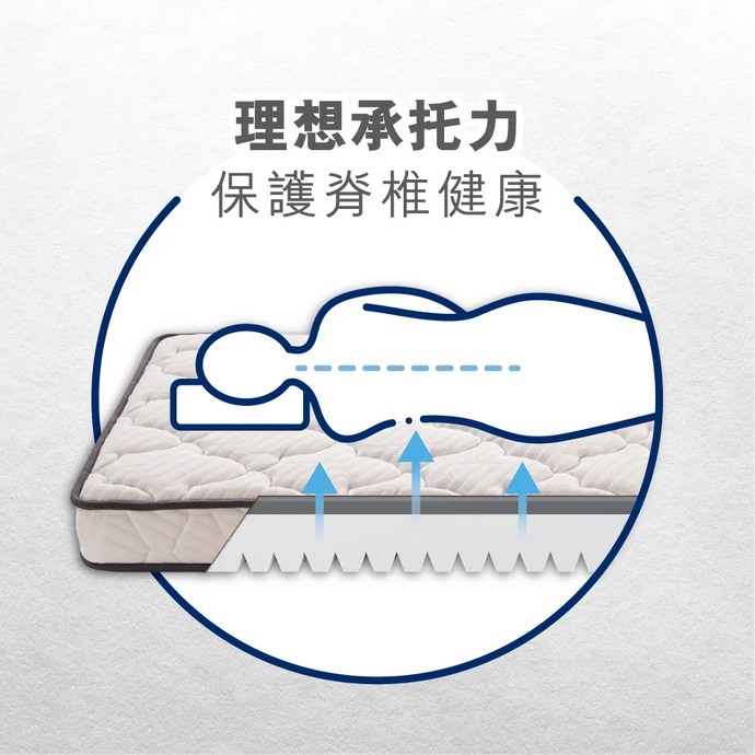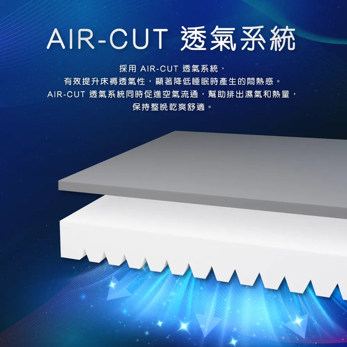 底層 Index Foam 承托棉採用 AIR-CUT 透氣系統,有效提升床褥透氣性,顯著降低睡眠時產生的悶熱感。AIR-CUT 透氣系統同時促進空氣流通,幫助排出濕氣和熱量,保持整晚乾爽舒適。