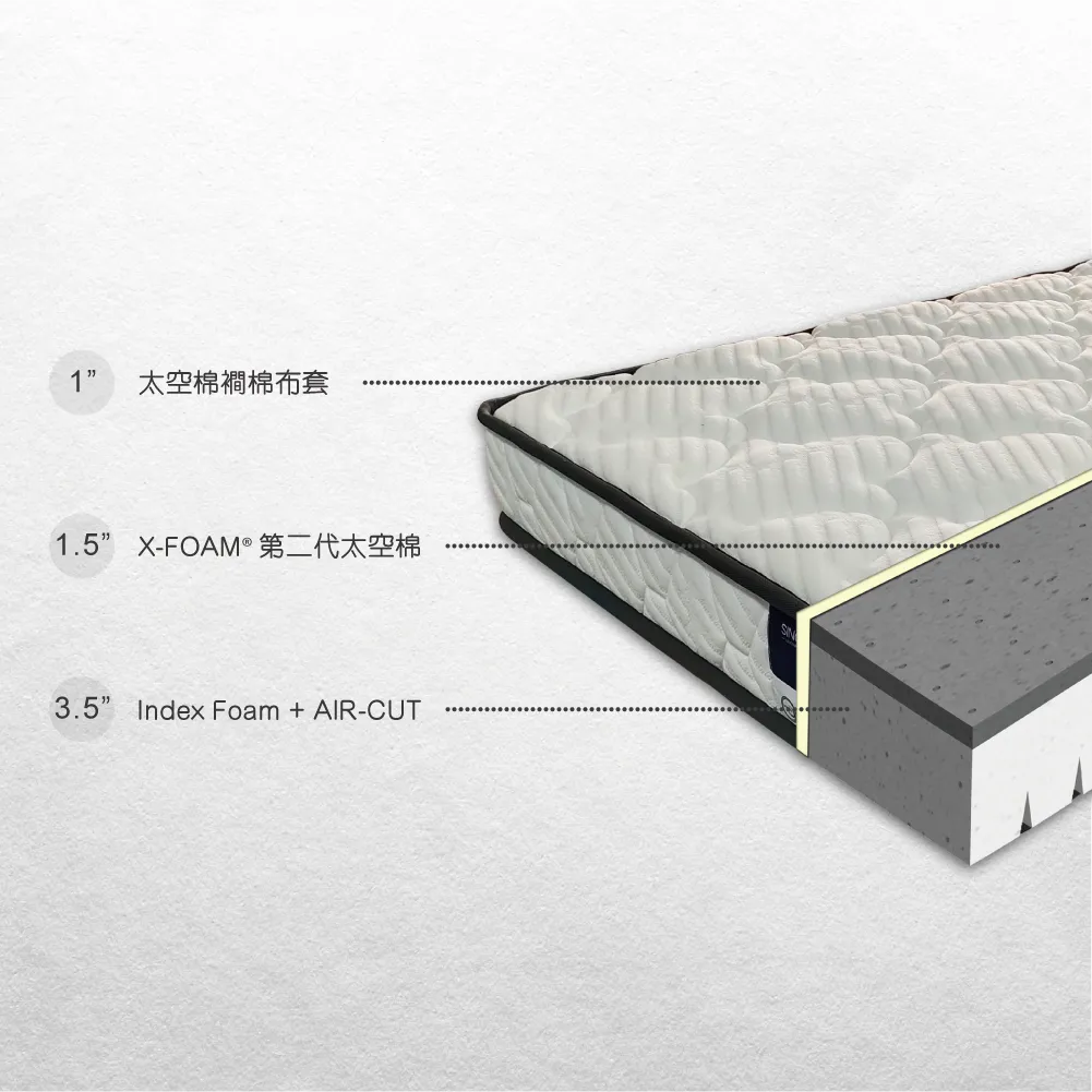 床褥面層採用第二代 X-FOAM® 太空棉,能完美貼合人體曲線,精準卸壓,帶來無壓睡眠體驗。底層則選用 Index Foam 承托棉,提供卓越承托力,支撐身體受壓部位,舒適感再提升。