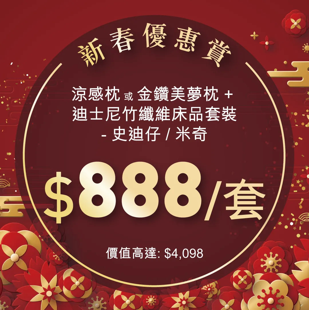 顧客可以優惠價$888購買超值床品套裝,包括:精選枕頭(2選1) + 迪士尼竹纖維床品套裝 (2選1)